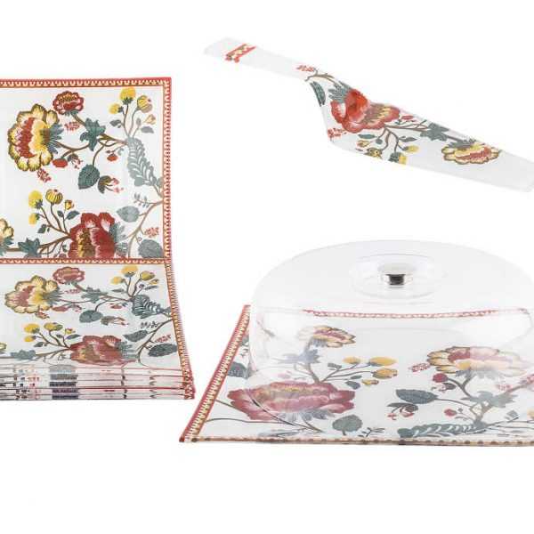 CAM BEYAZ KANAVİÇE DESENLİ KARE 9 PARÇA PASTA SERVİS SETİ