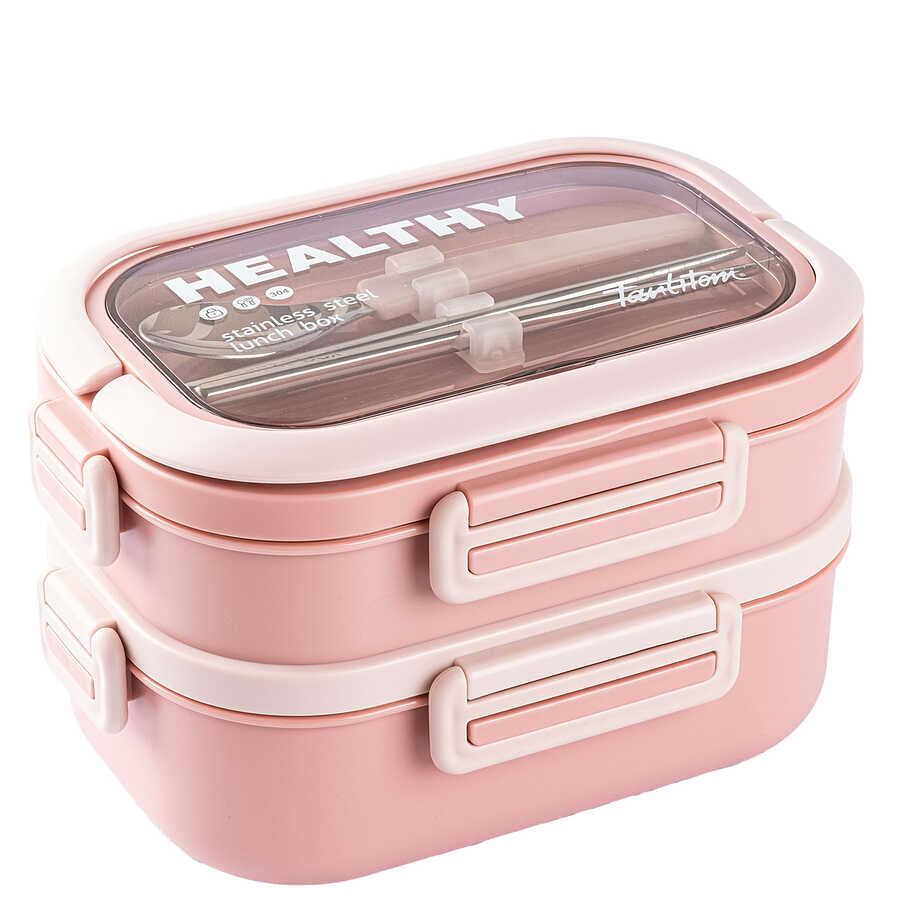 TANTİTONİ PEMBE PASLANMAZ ÇELİK DİKDÖRTGEN 2 KATLI CHOPSTICK VE KAŞIKLI YEMEK TAŞIMA KABI 1.65L